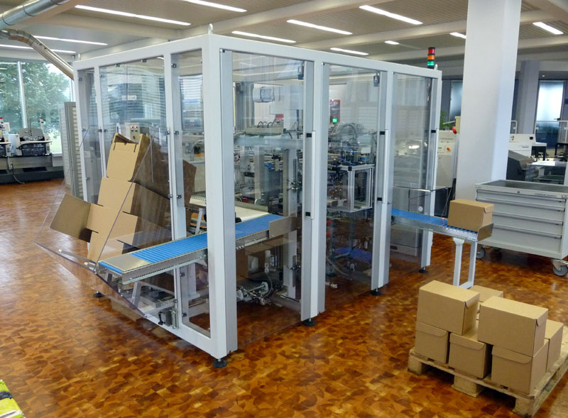 Машина для упаковывания автоматически получает пачки готовой продукции (журналов), выравнивает их, складывает в несколько слоев и распределяет по коробам. Тара подается в упаковщик в разложенном (плоском) виде, которую машина впоследствии раскрывает вокруг пачки готовой продукции. Клей наносится на заполненный короб. Сам короб – это коробка с самоскладным дном из гофрокартона, при необходимости ее можно открывать и закрывать несколько раз. Новый упаковщик аккуратно расставляет заполненные гофроящики друг на друга. После этого они могут быть перемещены на паллету вручную или автоматически при наличии специального устройства. Машина для упаковки журналов может обрабатывать продукцию размера A4, A5, A6 и DL в вертикальном и горизонтальном формате. На данный момент могут применяться два типа коробов: 305 x 215 x 220 мм и 320 x 215 x 220 мм (ширина x длина x высота).