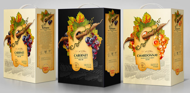 Серия упаковки выполнена в двух цветовых решениях – белом – для белых вин, и черном – для красных вин. В качестве фона использован графический пасторальный виноградный пейзаж.