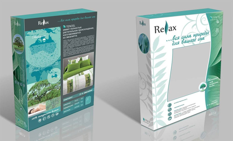 Коллекцию Relax открывает постельное белье, произведенное из эвкалиптового волокна. Упаковка комплекта выдержана в свежих и чистых оттенках зеленого в сочетании с белым. Выделиться на полке ей помогут нестандартные для этого продукта элементы дизайна, отсылающие нас к теме путешествий - карта произрастания эвкалиптовых лесов, путеводитель с энциклопедическими сведениями об эвкалипте и его полезных свойствах. Например, способности контролировать влаго- и теплообмен или уникальных антибактериальных и противоаллергенных характеристиках. Особо подчеркивается инновационность этого продукта - создание такой ткани стало возможно только при использовании нано-технологий.