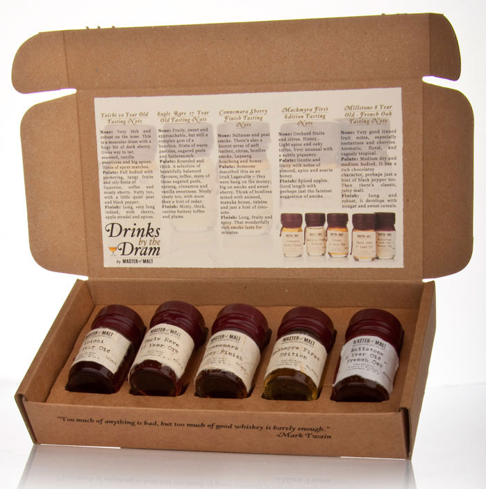 Компания Master of Malt – крупная британская компания по продаже и упаковке алкогольной продукции (в основном, виски и бренди), представила набор виски в оригинальной упаковке - Drink by the Dram. Упаковка выполнена в виде набора «пробников» для виски.