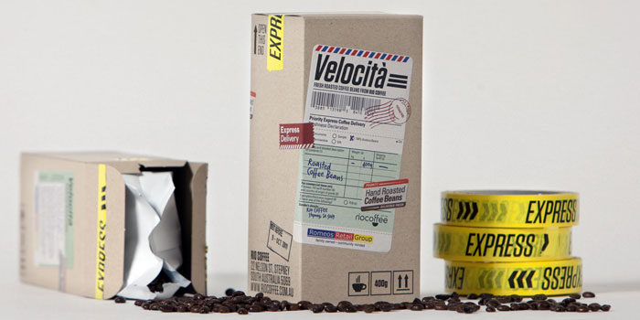 Velocita переводится с итальянского как скорость. В агентстве было решено обыграть это сделав упаковку в виде посылки курьерской экспресс-доставки. Чтобы подчеркнуть свежесть кофе, на коробку нанесены печати с датой обжарки и сроком годности. Упаковка запечатана желтой клеевой лентой «экспресс-доставка».