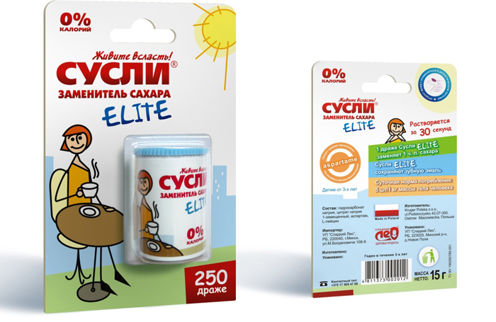 Компания «Сладкий Лео» самостоятельно провела редизайн заменителя сахара «Сусли Elite». Это предприятие специализируется на импорте заменителей сахара в республику Беларусь – заменителя сахара в таблетках, фруктозы, сорбита, ксилита. На протяжении 17 лет она занимается продвижением и реализацией заменителя сахара под торговой маркой «Сусли».