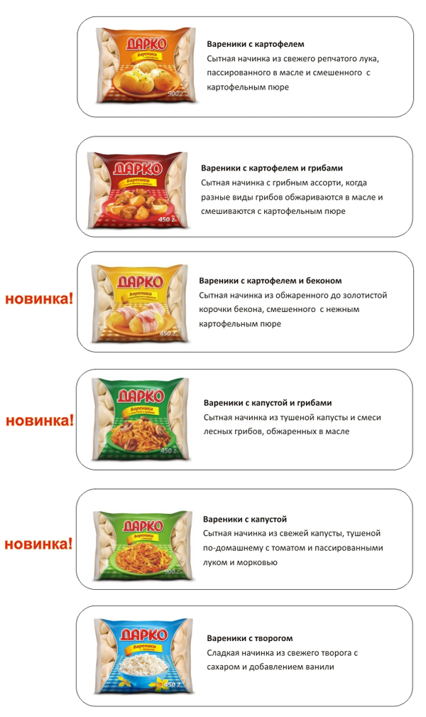 20 февраля 2012 в продуктовой линейке ТМ «Дарко» произошли изменения и главными героями этих перемен стали вареники. Линейка пополнилась новыми вкусами и обзавелась более современной упаковкой.