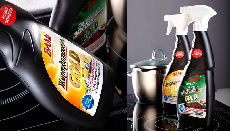 Основой этикетки стали наглядные иллюстрации мест использования чистящих средств и поясняющие надписи, играющие большую роль в процессе выбора покупателем в магазине.
