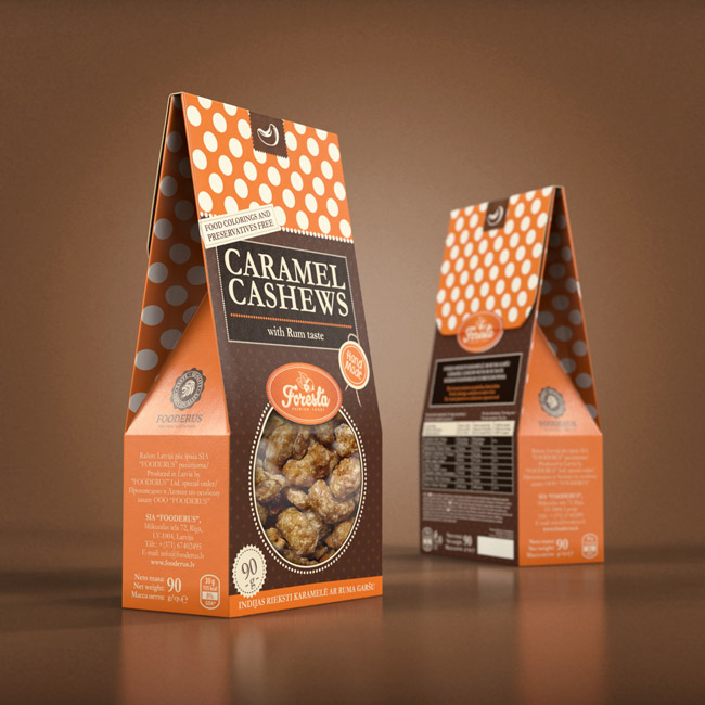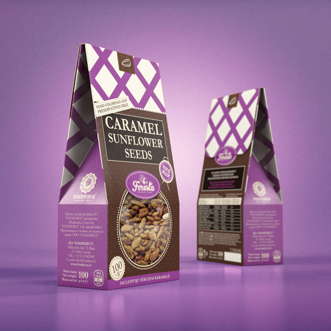 Латвийская компания Fooderus выпускает орехи и семечки в карамели. Перед студией Studio43 была поставлена задача разработать новый дизайн упаковки.