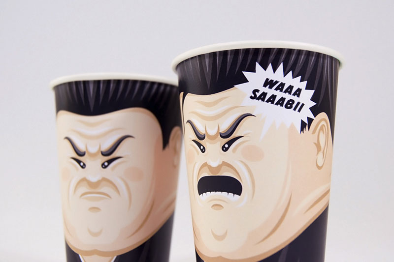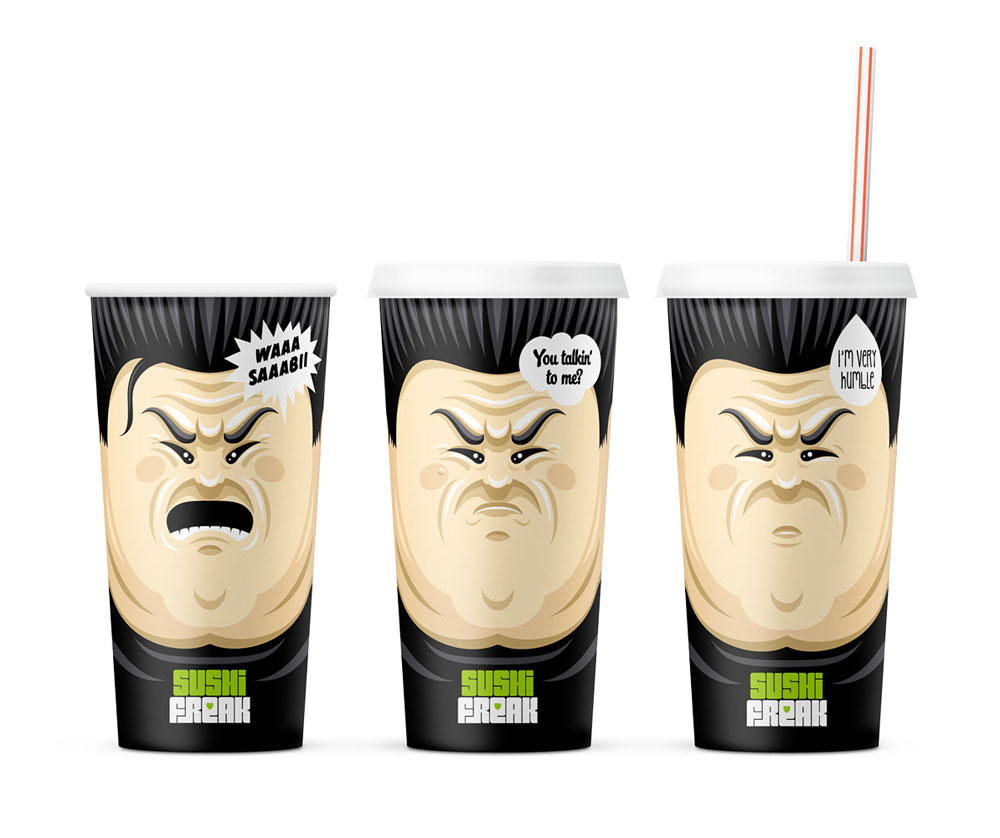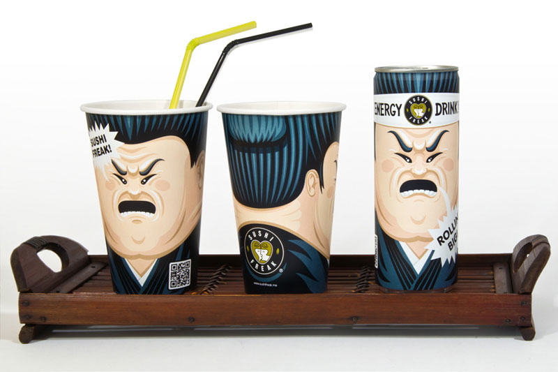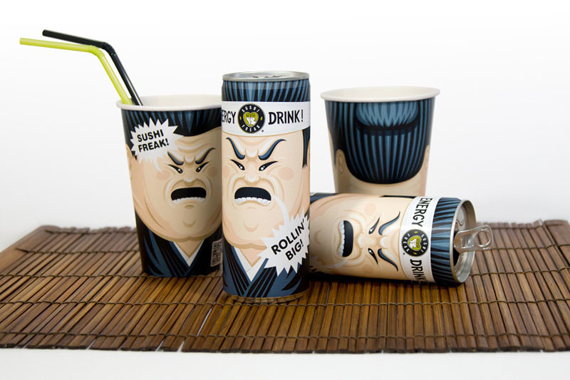 В итоге тесного сотрудничества с клиентом в Hattomonkey родился образ самого большого любителя суши. Крупное, эмоциональное лицо сумоиста идеально вписалось в стакан для прохладительных напитков и упаковку для энергетика. По задумке дизайнеров посетителям бара предстоит потягивать напитки прямо из головы разгневанного сумоиста.