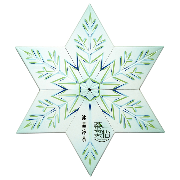 Шестиугольная упаковка выполнена из бумаги без помощи клея. Своим внешним видом она напоминает снежинку, сходство усиливается при помощи рисунка на упаковке. Раскрытая упаковка призвана напоминать ледяной айсберг.