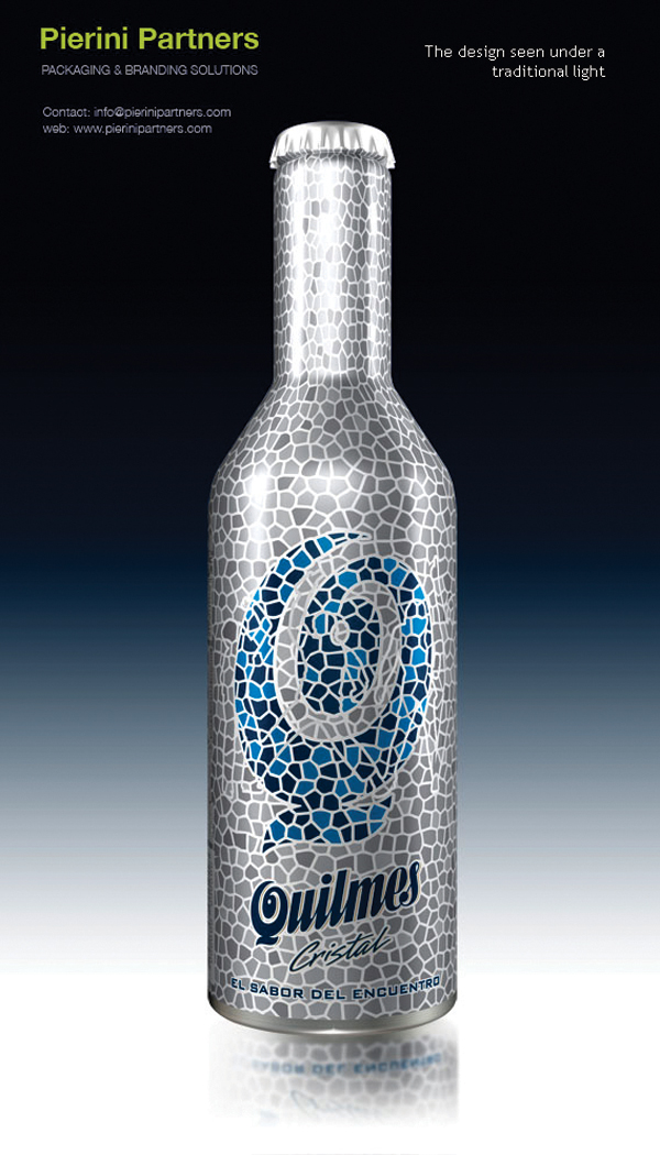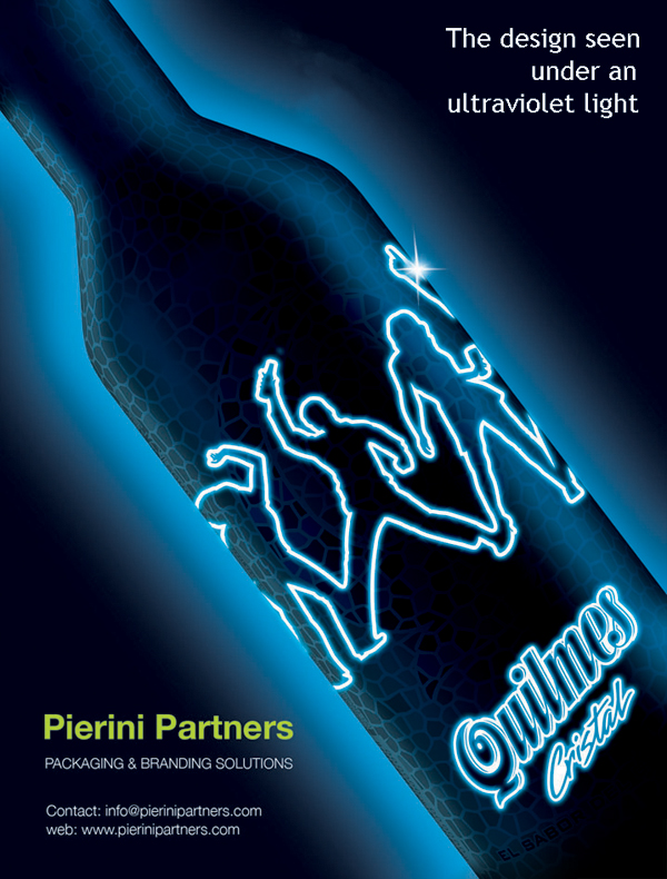 Самый известный аргентинский пивной бренд Quilmes представляет новую алюминиевую бутылку, изображение на которой меняется под ультрафиолетовым светом. Дизайн упаковки разработали специалисты аргентинского филиала Pierini Partners.