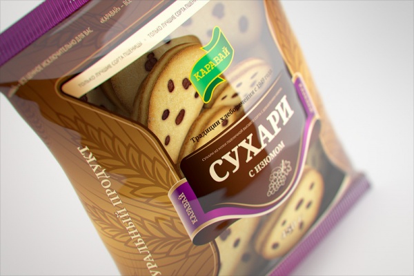 Московское агентство «Кукумбер» разработало дизайн упаковки линейки сухарей для хлебной компании «Каравай». Сухари выпускаются хлебозаводом "Каравай" (Санкт-Петербург).