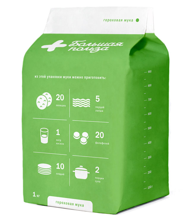 Игорь Марков: "Задумывая дизайн упаковки «Большой пользы», мы хотели донести до покупателей, что мука — это основа для множества вкуснейших блюд. Зная, что многие люди хотят видеть на полках магазинов гороховую, кукурузную, рисовую и гречневую муку, мы использовали простые и понятные цвета для идентификации каждого вида."