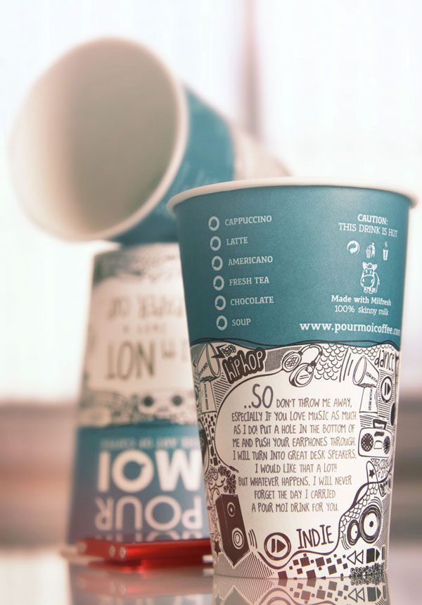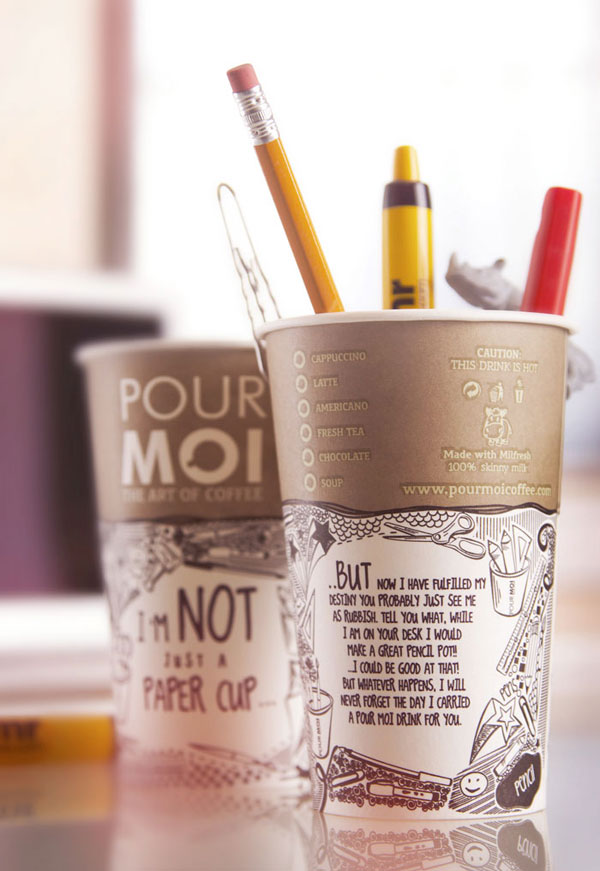 В британской студии SMR Creative разработан дизайн для кофейных стаканчиков Pour Moi. Главной темой дизайна стала переработка использованной упаковки.