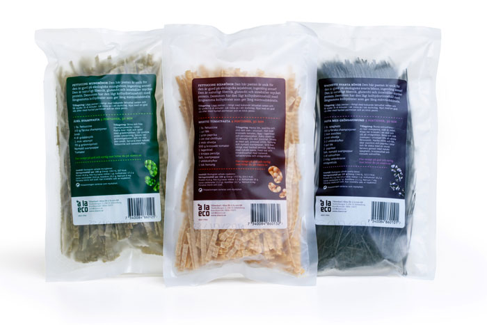 Дизайнеры отмечают, что все сделано из органических бобов, богатых минералами, без клейковины и лактозы. Агентство Kollor создало общую концепцию дизайна для à la eco. Это включало брендинг, разработку каталогов продукции и дизайна упаковки. Органическая паста – самый новый продукт в ассортименте компании, продающийся в магазинах по всей Скандинавии.