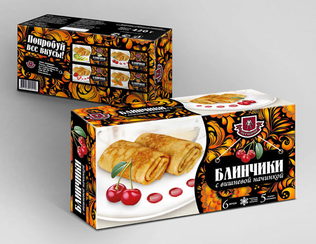 Старинным русским узором "Хохлома" украсились сладкие блинчики с начинками джемов (яблоко, клубника, абрикос, вишня), сосиски "Говяжьи Находка", сосиски "Сливочные Находка", колбаса вареная "Орловская Люкс", "Заречная", "Сливочная".