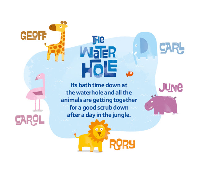 Изображение бассейна на упаковке служит элементом, объединяющим всю линейку. К бассейну приходят звери на водопой. За каждой позицией закреплены свои персонажи. Шрифт и иллюстративный стиль отражает современные тенденции в оформлении детских книг и фильмов.