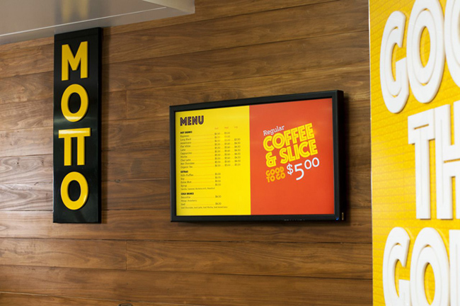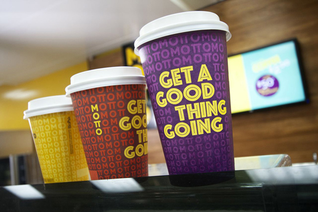 Агентство Marque из Новой Зеландии провело работу по созданию нового бренда Motto. Это небольшие кофейни, расположенные в магазинах при заправочных станциях, а также в отдельных помещениях.