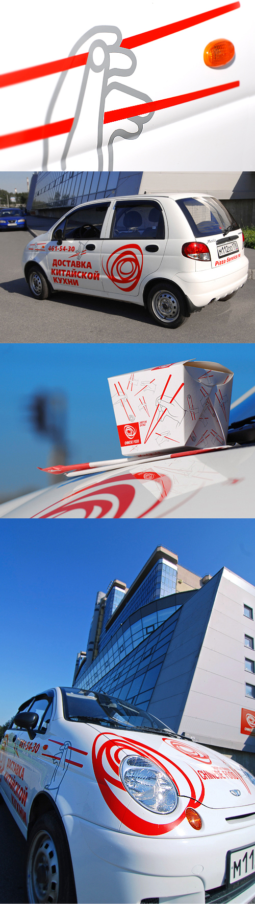 Первым и главным элементом стиля стала упаковка, включавшая в себя непосредственно бокс (тот самый куб, в котором кроется энергия), упаковка палочек, полиэтиленовый/крафт-пакет, стаканчики для супа, и, конечно, транспорт. Под проект специально закуплены белые Daewoo Matiz, которые были оформлены в едином дизайне.