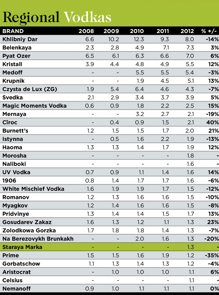 Водка в листинге представлена 44 брендами, из которых 13 глобальные и 31 региональные. «Старая Марка» имеет региональный статус, так как весь объем её продаж приходится на Россию и страны СНГ.