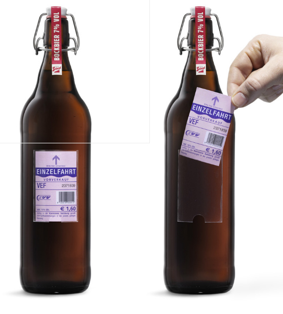 В рождественские праздники любители пива налегают на Stiegl’s Bock. Пиво довольно крепкое и производитель задумался над безопасностью покупателя. Вместо того, чтобы сесть за руль, ему предлагается воспользоваться общественным транспортом. С этой целью, на место пивной этикетки, в специальный карман поместили проездной билет. Производитель хочет быть уверен, что его потребитель доберется до дома целым и невредимым.