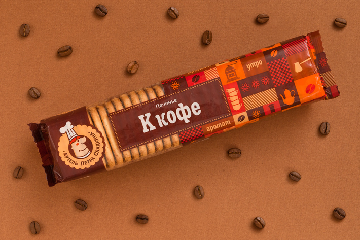 Печенье, выходящее под этой торговой маркой, имеет категорийные названия «К кофе», «Чайное» и т.д. Каждому наименованию печенья были подобраны визуальные и вербальные ассоциации, которые стали элементами мозаичного рисунка. Печенье «К кофе с ароматом топленого молока», например, содержит несколько «кофейных», бодрящих и теплых ассоциаций – кофейное зернышко, чайная ложка, чашка, кофейник и бутылка с молоком – в очень чистом, лаконичном исполнении.