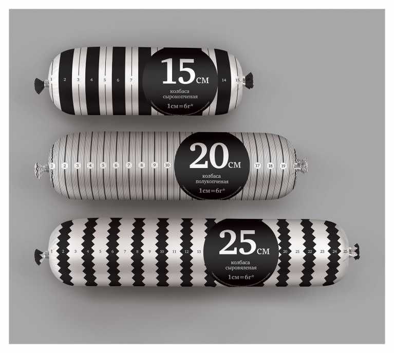 «Дизайн упаковки мясных продуктов, представленных на отечественном рынке, огорчает своей предсказуемостью и робким поведением. Хотелось разбавить тенденцию, отказавшись от решений, характерных для этой продуктовой категории. Принт с изображением линейки добавляет упаковке функциональности, оставив и эмоциональную составляющую. Такой декор поможет: легко посчитать, сколько граммов колбасы в отрезанном ломтике; соблюдать правильные пропорции в рецептах; ровно отрезать кусочки; следить, сколько колбасы съели в твоё отсутствие. Дифференцировать сорта колбасы поможет паттерн. Для удобства линейка дублируется на всех сторонах продукта», - рассказала Unipack.Ru Мария о своем проекте.