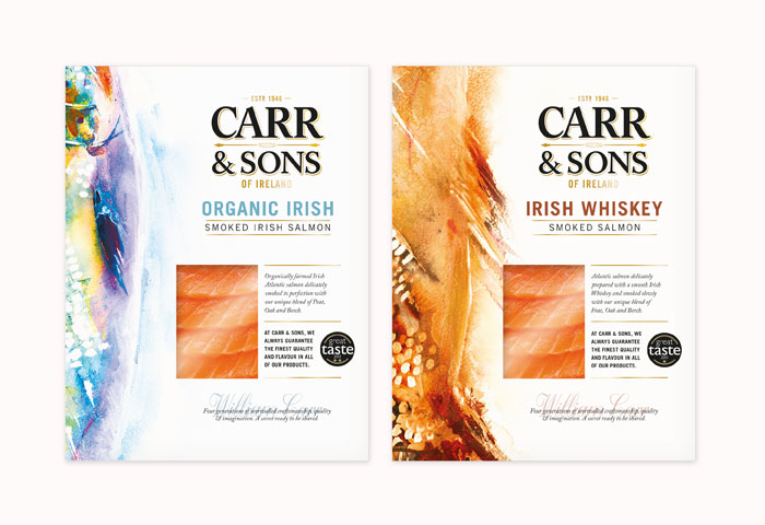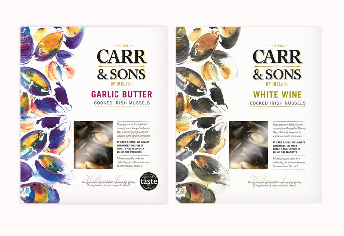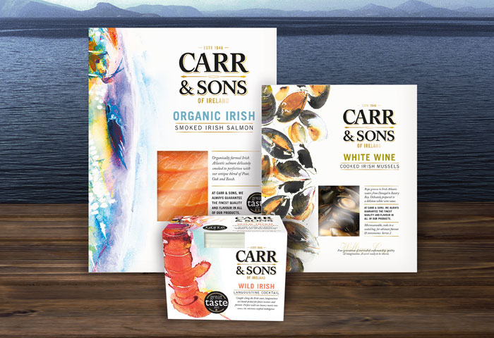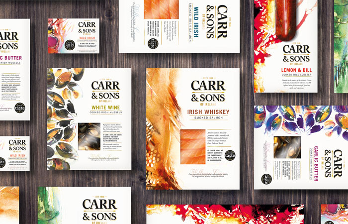 Carr and Sons – это семейный бизнес, который занимается производством премиальных морепродуктов из Ирландии. Дизайн говорит о знаниях и мастерстве тех, кто занимается приготовлением морепродуктов Carr and Sons. Новая айдентика основана на наследии компании. Простое и изящное оформление упаковки позволит продукту выделиться на полке.