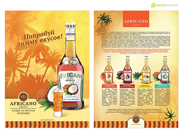 Дизайн-студия «Репростудия» (Беларусь) разработала дизайн серии этикеток для ликера «AFRICANO» Гомельского ЛВЗ «Радамiр». Перед дизайнерами стояла задача создать современную молодежную модную торговую марку десертного ликера.