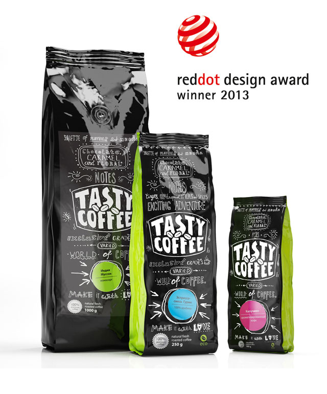 В этом году на конкурс было прислано 6800 работ из 49 стран, из которых международное жюри выбрало лучшие проекты. Дизайн упаковки для марки TASTY COFFEE награжден в категории "Упаковочный дизайн". Присуждение Red Dot дает возможность победителям позиционировать себя и свой продукт на мировой арене, являясь своеобразным международным знаком качества в области дизайна, говорят в Muhina Design.