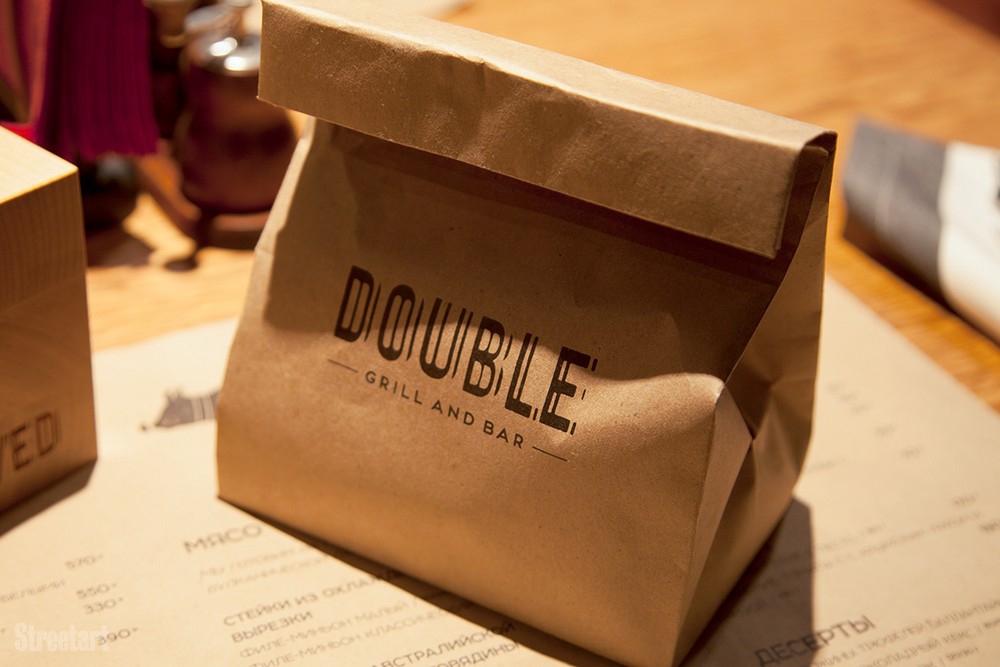 Айдентика Double Grill & Bar разаработана в стиле раздвоения объектов, которая обясняется как названием бара (double с англ. – двоящийся), сутью питейного заведения, а также видением окружающего через граненый стакан.