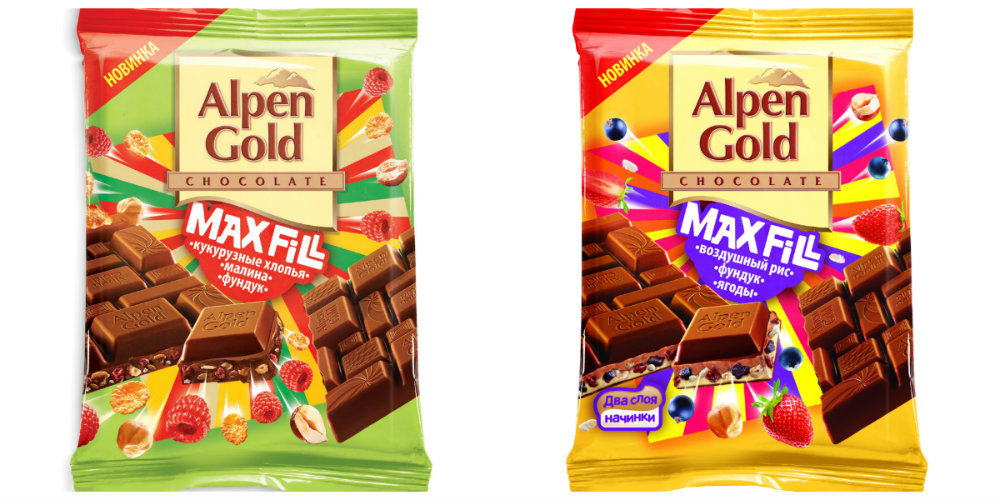 Мон’дэлис Русь выпустила новинку – Alpen Gold MaxFill. Линейка представлена двумя вкусами: «Воздушный рис, фундук и ягоды» в двухслойной начинке с молочным вкусом и вкусом карамели и «Кукурузные хлопья, малина и фундук».