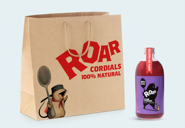 На этикетке напитков изображена маленькая мышка. Она обозначает малышей, а также мельчайшие детали, которые делают всё лучше. Но за ней тенью стоит большая картинка, большой брат, большие идеи и большие дела – это мышка, которая умеет рычать! Яркие цвета и игривый шрифт делают дизайн напитков Roar Cordials забавным для детей. На ярких полосках, приклеенных к крышечкам бутылок, написано: «На 100% без добавок, угрожающих здоровью!».