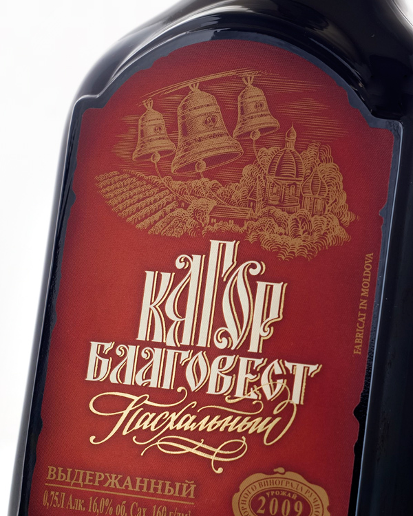 Иллюстрация храма и трех колоколов, оповещающие о начале церковной службы, усиливают основную идею дизайна этикетки – ритуальное вино, несущее в себе традиции веры, таинство причастие и символизирующее кровь Христову. Благодаря своей прямоугольной форме бутылка из темно-коричневого вина напоминает храм. Даже посадочное место под винную этикетку повторяет своды храма и иконостаса.