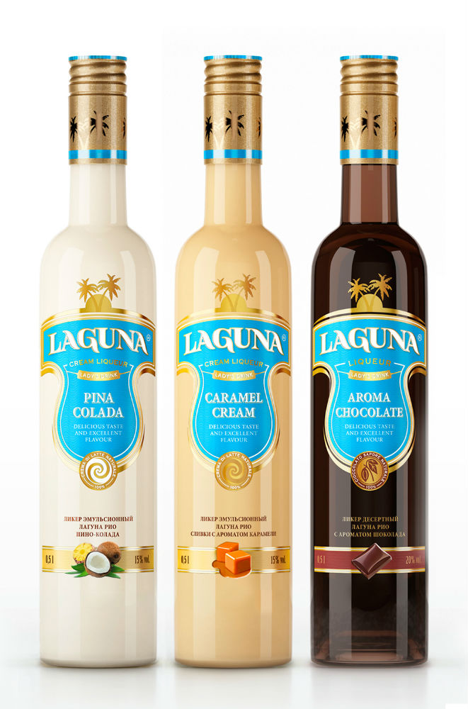 Большинство крем-ликеров выпускаются в низких округлых бутылках. Благодаря внешней привлекательности самого напитка, его выгодно показывать покупателю. Поэтому высокая и стройная бутылка, нехарактерная для этой категории, выделяет «Laguna» среди конкурентов и, в то же время, апеллирует к женственности и изящности. Силуэты двух пальм на фоне солнца ассоциируют продукт с известными ликерами, богатыми историей («Malibu», «Passoa»). Форма этикетки напоминает бокал харрикейн, в котором традиционно подаются сладкие коктейли. Она близка к форме капли и передает консистенцию напитка, густую и тягучую. Цвет ликеров удачно контрастирует с цветами этикетки. Насыщенный голубой и золотой, как и силуэты пальм, созвучны названию ликера, «Лагуна». Иконкообразная, в стиле современных цифровых тенденций, продуктовая зона не перегружает композицию.