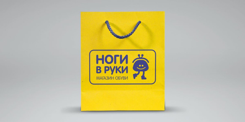Сочетание синего и желтого, а также использование бренд-персонажа в сочетании с забавными фразами – такова основа фирменного оформления магазинов «Ноги в руки».
