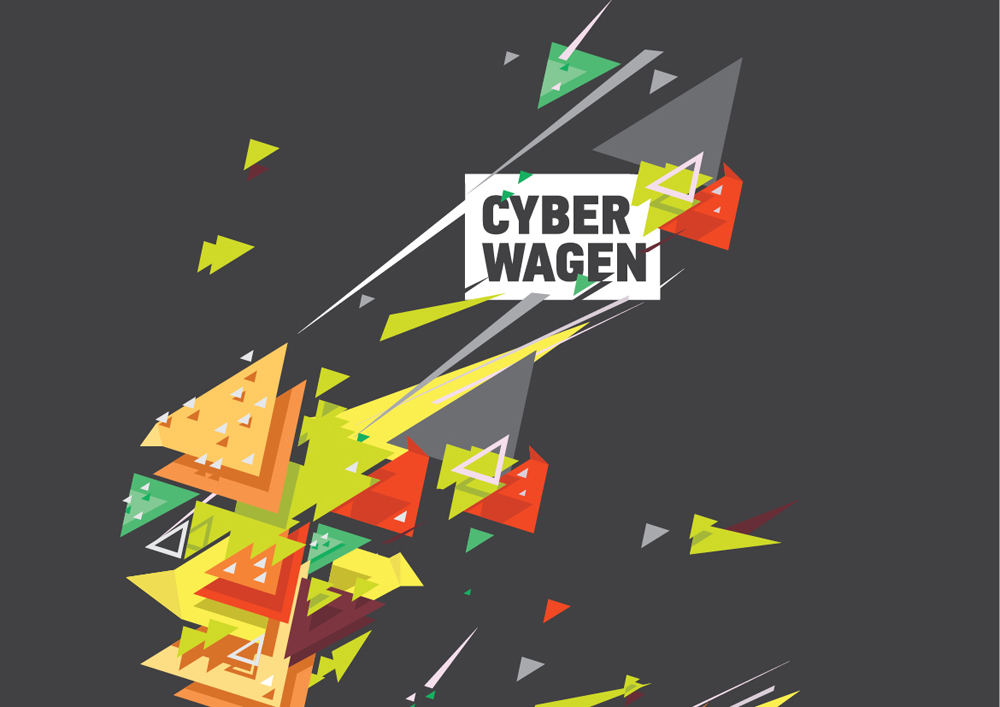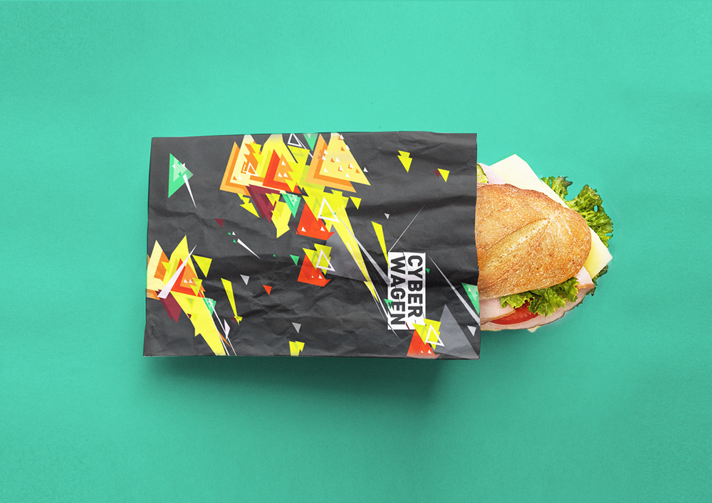 В питерском агентстве Shishki разработан фирменный стиль для мобильного пункта по продаже сандвичей и напитков Cyberwagen. Бургерная создана на на базе микроавтобуса Volkswagen T2, привлекающий людей при помощи современных интерактивных развлечений.