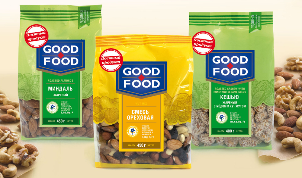 Великий Пост — самый продолжительный и строгий из всех постов. В это время попадают под запрет многие гастрономические удовольствия. Чтобы разнообразить питание людей, соблюдающих требования православного канона, Группа компаний «ГУД-ФУД» выделила продукцию, которую можно употреблять в пост: «Кешью жареный» 400 г, «Кешью жареный с медом и кунжутом» 400 г, «Миндаль жареный» 450 г, «Смесь «Ореховая» 450 г, «Смесь «Сладкая» 450 г.