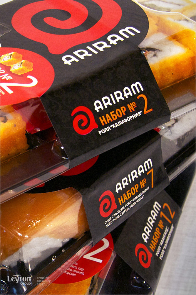 Leyton предложил глобально поменять дизайн торговой марки и упаковки. Новый логотип лучше указывает на товарную группу, значок напоминает ролл, а новый шрифт выглядит современней и хорошо читается. В оформлении упаковки использован блочный принцип построения композиции. Торговая марка стала основным блоком, что решило задачу акцента на бренде. А изображение и описание вкуса заняли другой блок. В третьем блоке была размещена фотография реального шеф-повара, отвечающего за производство суши и роллов в компании Арирам. На других товарных группах также появятся фотографии реальных шеф-поваров, отвечающих за производство соответствующих товарных групп. Для этого была проведена специальная фотосъемка сотрудников. Блочное построение позволило решить проблему разноформатных упаковок — оно хорошо адаптируется как к низким так и к высоким упаковкам, к разным формам и размерам контейнеров для суши, роллов, салатов и другой готовой продукции.