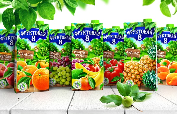 Студия Акима Мельника (Беларусь) разработала дизайн упаковки для соков и нектаров «Фруктовая 8». Заказчиком выступила компания «Оазис Груп».