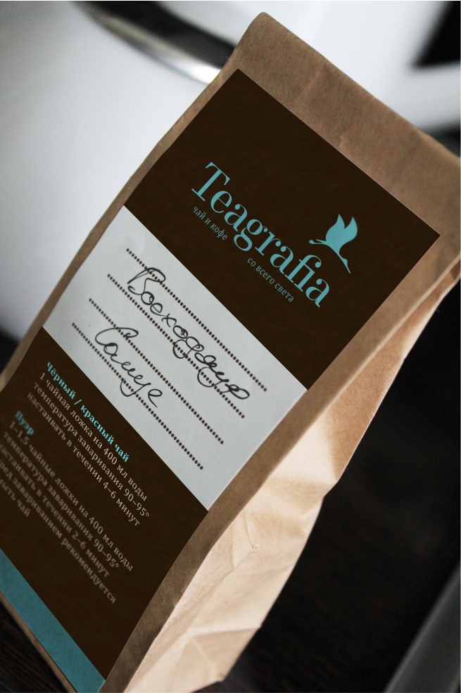 Агентство Z&G. Branding разработало название и логотип для новой сети магазинов чая и кофе. Бренд получил название Teagrafia. Это составное слово, оно образовано от «Tea» — с английского «чай» и «grafo» — от греческого — «пишу». Teagrafia — описание множества сортов чая, наука о чае. Кроме того, название схоже с «география», что вызывает дополнительные ассоциации об огромном количестве сортов чая и кофе со всех концов земного шара.