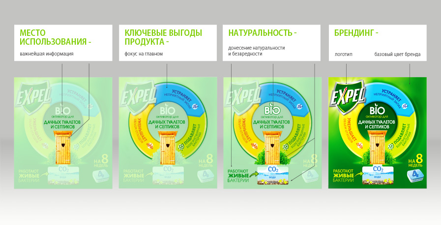 Вторым этапом стала реализация позиционирования в дизайне упаковки и повышение общей заметности бренда на полке. Анализ результатов исследований сильно повлиял на структуру разрабатываемого дизайна упаковки: были найдены правильные RTB для категории и отражены ключевые преимущества (работа живых бактерий) в коммуникации.