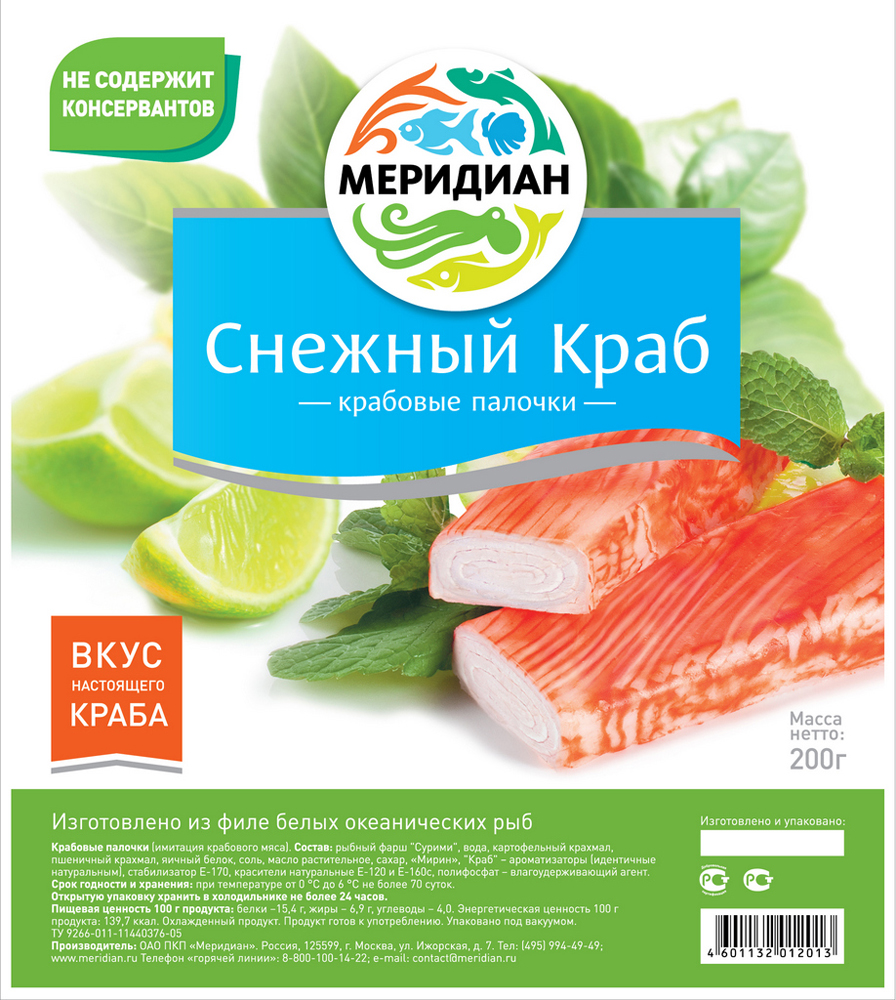 Для идентификации палочек новой рецептуры разработан значок «Не содержит консервантов» и интегрирован в дизайн упаковок: охлажденные крабовые палочки «Снежный краб», 100 г; охлажденные крабовые палочки «Снежный краб», 200 г; традиционные охлажденные крабовые «Меридиан», 200 г.