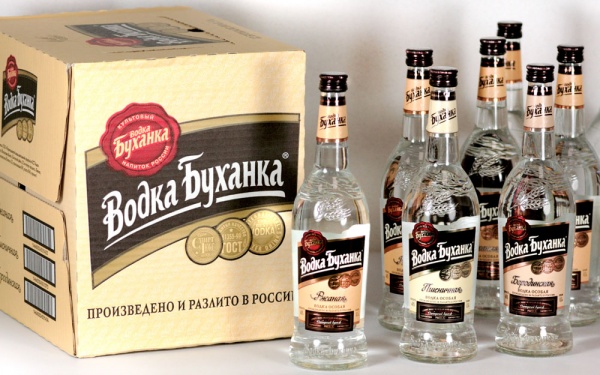 Шрифтовое решение лого-блока, форма бутылки, дизайн этикеток и яркая цветовая гамма представленных вкусов подчеркивает и выгодно отличает водку «Буханка» от конкурентов.
