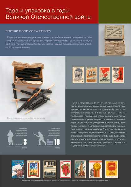 Стенды содержат эксклюзивные материалы о видах упаковки военных лет (от ящиков для снарядов до спичечных коробков), о роли бытовой тары в боях за целые города, об этикетке как идеологическом оружии Победы.