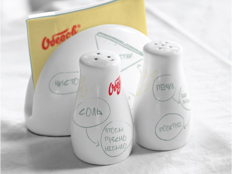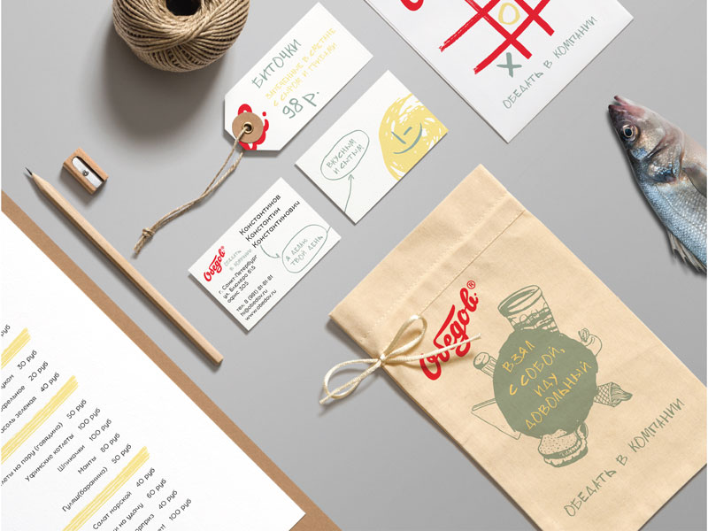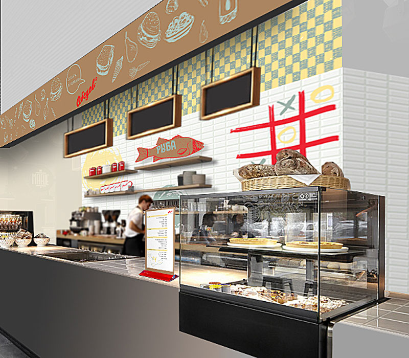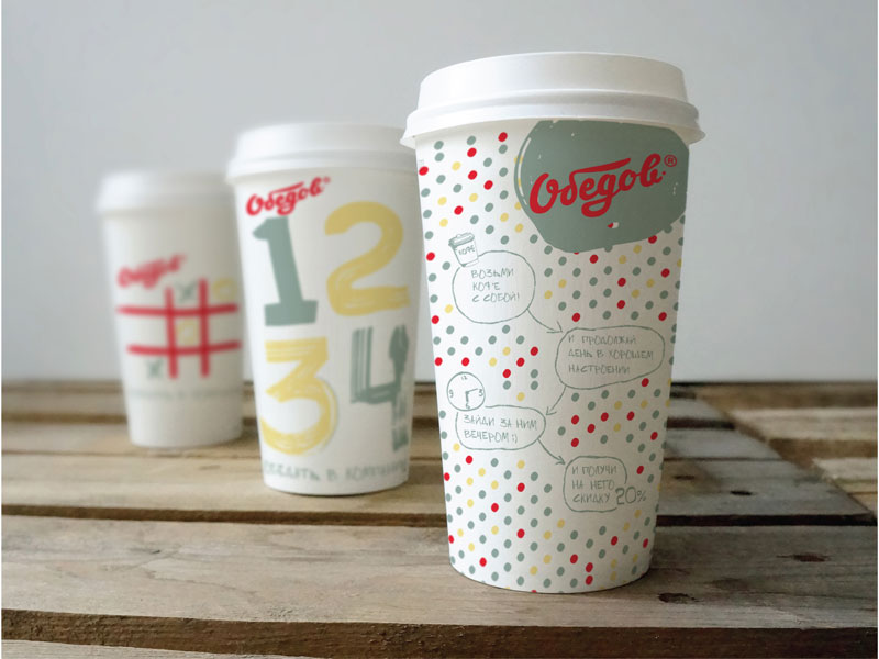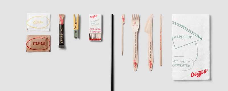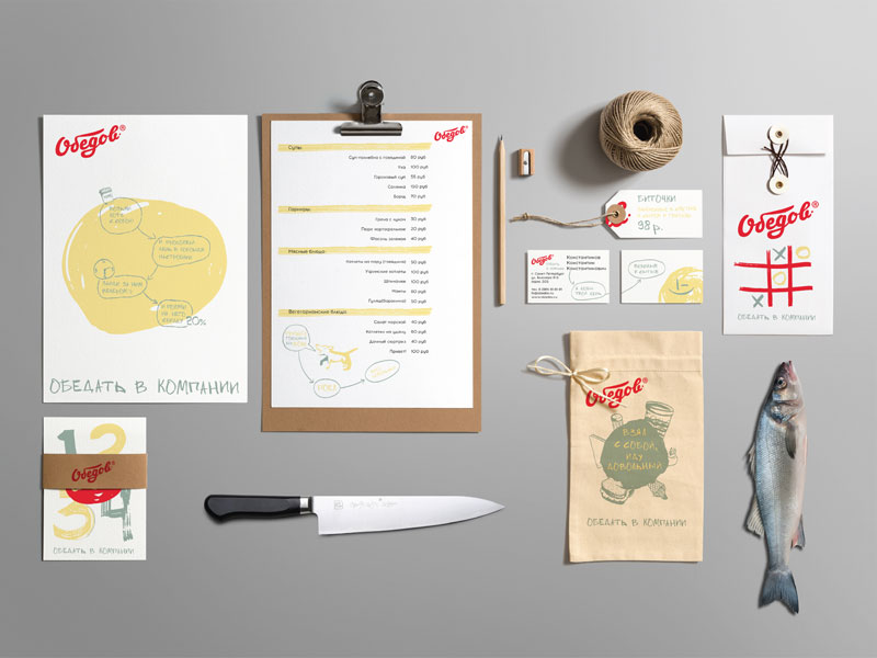 Разрабатывая фирменный стиль и дизайн ресторанов самообслуживания "ОБЕДОВ", в котором по демократичным ценам может позавтракать, пообедать и даже поужинать любой желающий, креаторы Brandson Branding Agency стремились к тому, чтобы во время обеда людей окружало как можно меньше «казёнщины». Это касается всего, что присутствует вокруг человека: шрифтов на сообщениях и в меню, цвета печатных материалов и стиля, который отсылает к немудрёным, но знакомым играм, которые практически не требует реквизита.