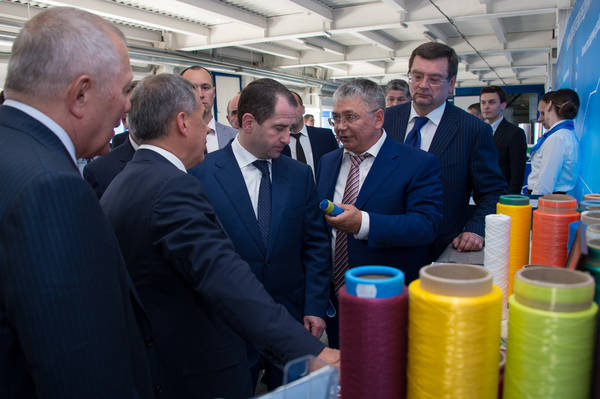 По прибытии на территорию индустриального парка Рустам Минниханов осмотрел информационные стенды, на которых были представлены основные этапы развития индустриального парка за 7 лет. Напомним, что индустриальный парк "Камские Поляны" был основан в 2008 году. Производственные площади расположены в пгт Камские Поляны. Ассортимент выпускаемой продукции включает в себя большой выбор скретч-пленки (ручная, машинах - простая и универсальная, POWER), полипропиленовые мультифиламентные и пневмотекстурированные нити. Базовым предприятием индустриального парка "Камские Поляны" является ПАО "Нижнекамскнефтехим". Сырьем для производства большинства продукции служат полиэтилен и полипропилен, выпускаемые на нижнекамском предприятии.