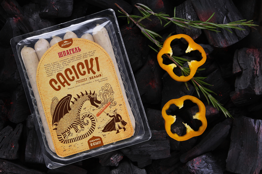 Основой дизайна стала стилизованная под гравюру авторская иллюстрация, дополненная фотоизображением продукта. Ее центральные элементы – бренд-персонажи Шпагель и Цмок (огнедышащий дракон, мифическое существо из белорусских сказок), которые показаны в шутливой ситуации приготовления продукта.