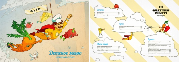 Для «Quattro Piatti» в дизайн-студии «Провинция» был доработан логотип и созданы элементы фирменного стиля заведения на основе оригинальных иллюстраций и полосок свеженарезанной пасты.