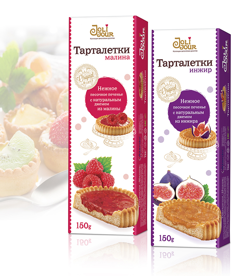 Для того чтобы подчеркнуть европейское происхождение лакомств, использовались элементы ретро стиля и стилизованная эмблема «Original Brand». Ретро стиль так же отлично способствовал созданию образа баловства, исполнения прихоти, отвечающей основной идее продукта. Для создания акцента на том, что данное угощение – это, прежде всего, десерт. Изображение тарталетки было размещен крупным планом, демонстрируя преимущества в виде толстого слоя аппетитного джема и нежного рассыпчатого бисквита. Все это было выполнено в общей стилистике продукции «Joli Jour».