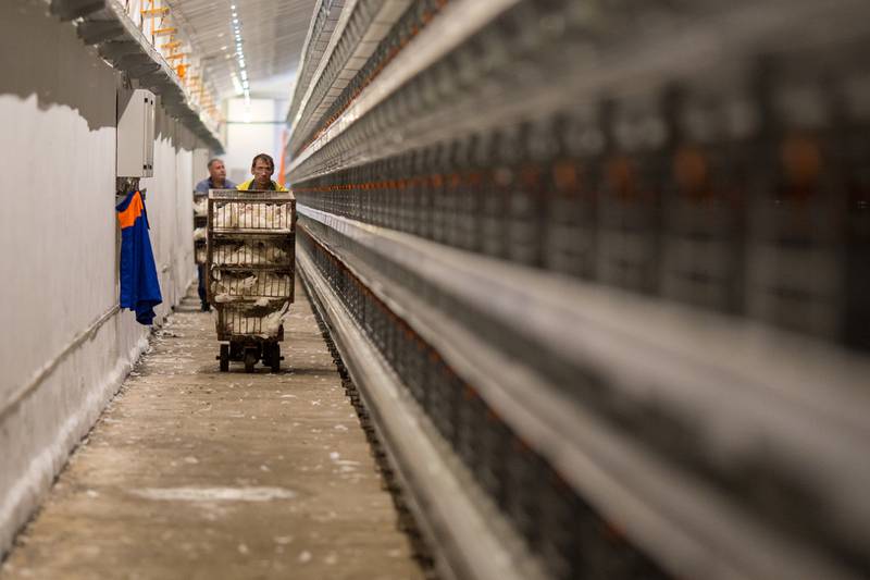Автоматизирован и процесс сбора яиц. Система лифтов и конвейерных лент привозит продукцию прямо на склад, который расположен в этом же корпусе. При выходе на плановую мощность в сутки здесь планируют получать 80 тысяч яиц.