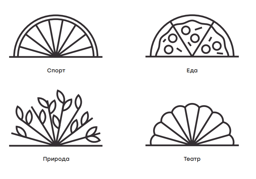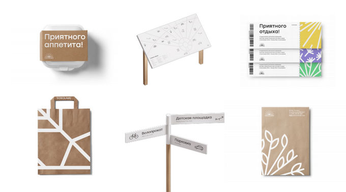 Они предложили фирменный стиль и элементы айдентики. Логотип представляет собой лучи солнца, которые отходят от названия парка. Лучи символизируют просеки парка. Если смотреть на парк сверху, видно, что просеки сходятся в центре. У логотипа есть варианты, которые будут использоваться применительно к разным объектам и видам деятельности парка - «Еда», «Спорт», «Знания», «Экспо» и т. д.