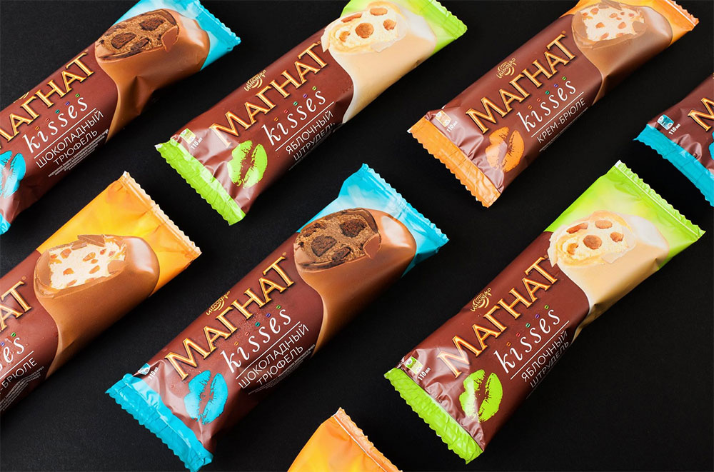В этом году один из лидеров рынка мороженого, бренд "Магнат", выпустил линейку - МАГНАТ KISSES. Мороженое выпускается в трех вкусах: шоколадный трюфель, крем-брюле и яблочный штрудель.
